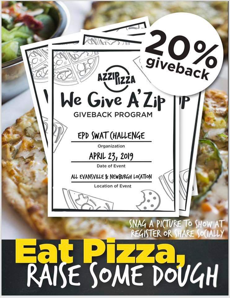 Azzip Pizza is a proud sponsor of the "We Give A’ Zip" giveback program . Today they will donate 20% of pretax sales with the proceeds going to help out the EPD Foundation SWAT Challenge. Guests must present a printed or electronic voucher at the time of purchase for their sales to be counted towards the final giveback amount.